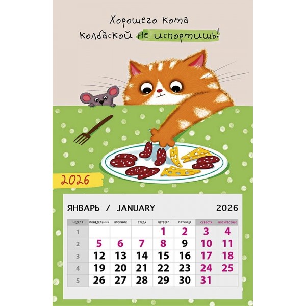 Календарь на магните 95х145 Хорошего кота колбаской не испортишь! 2026