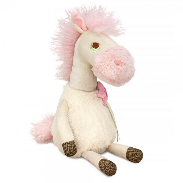 Ослепительно красивая лошадка Пола сшита из софта и короткого меха молочного цвета. На мордочке вставка из меха нежно-розового цвета, выразительные глазки Полы вышиты. В ушках вшит розовый софт. Грива и хвост из длинного меха в тон мордочки. Копыта выполнены из твида в «ёлочку». На груди у лошадки милый аксессуар – сшитая вручную розовая звёздочка из софта, с вышивкой и атласными лентами.