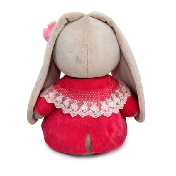 На Зайке очень красивое пальто из плотной, кораллового цвета ткани со вставкой из х/б ткани в горошек и шикарного кружева. Спереди пальто украшает бант из репсовой ленты цвета розовой камелии. На ушке у Зайки розочка из лент.